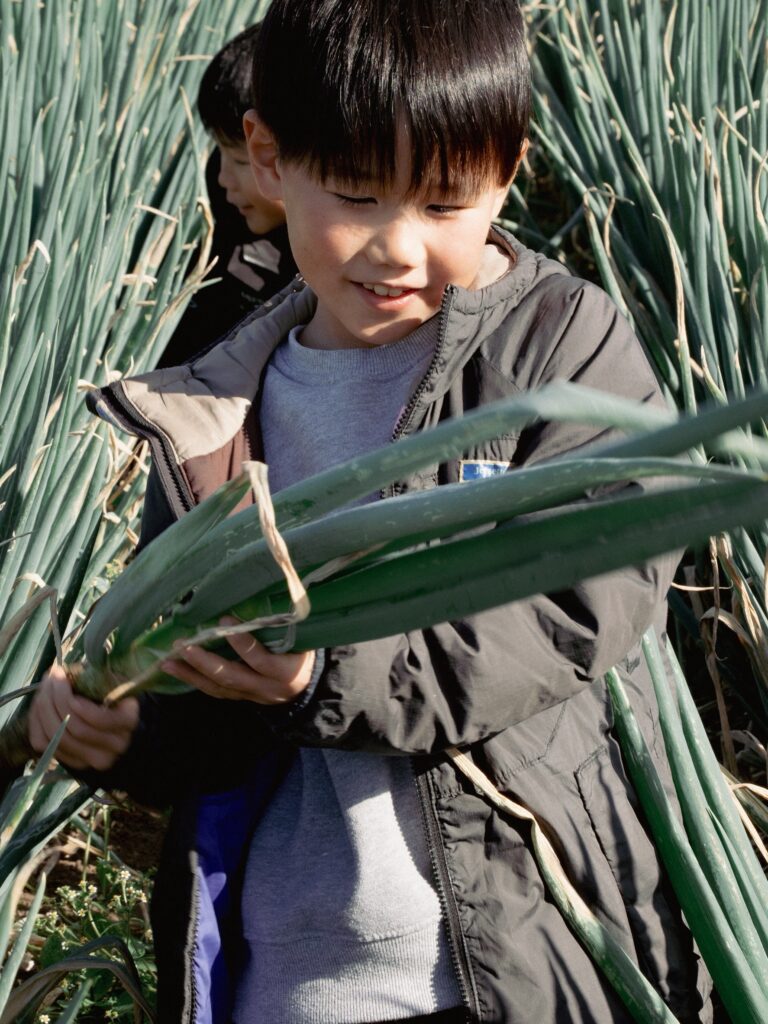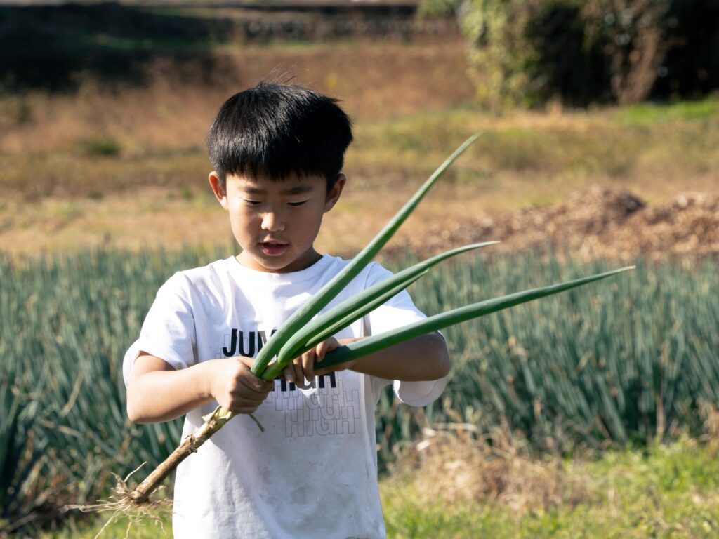 自分の力でネギを引き抜いて誇らしそうにする子、